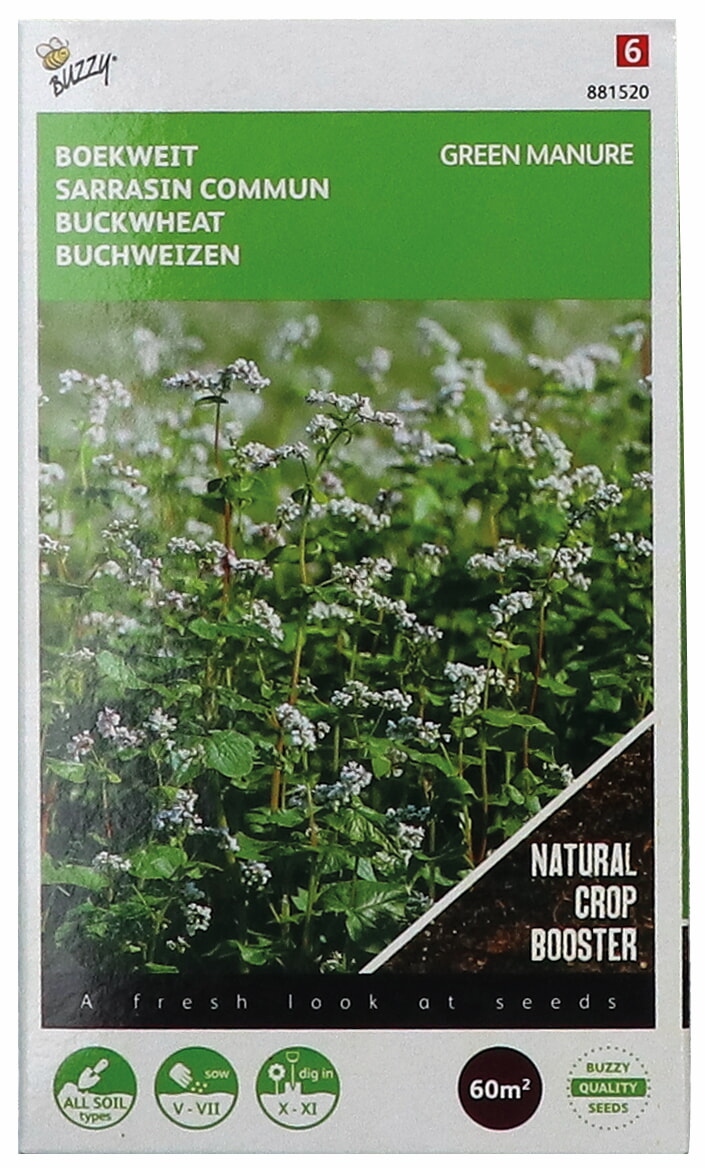 Boekweit bloeit met helderwitte bloemen waar veel bijen en vlinders op af komen. Boekweit is een uitstekende, snelgroeiende groenbemester omdat het stikstof bindt in de grond. Na de oogst van een gewas wordt daarom boekweit gezaaid om de grond bezet te houden. Aan het einde van het seizoen wordt boekweit ondergespit en brengt het organische stof in de grond. Zowel de planten als de zaden zijn niet winterhard. Inhoud: 150g is geschikt voor 30 m²Waarom Boekweit?• Arme zand- en veengronden• Zeer geschikt voor bijen en vlinders