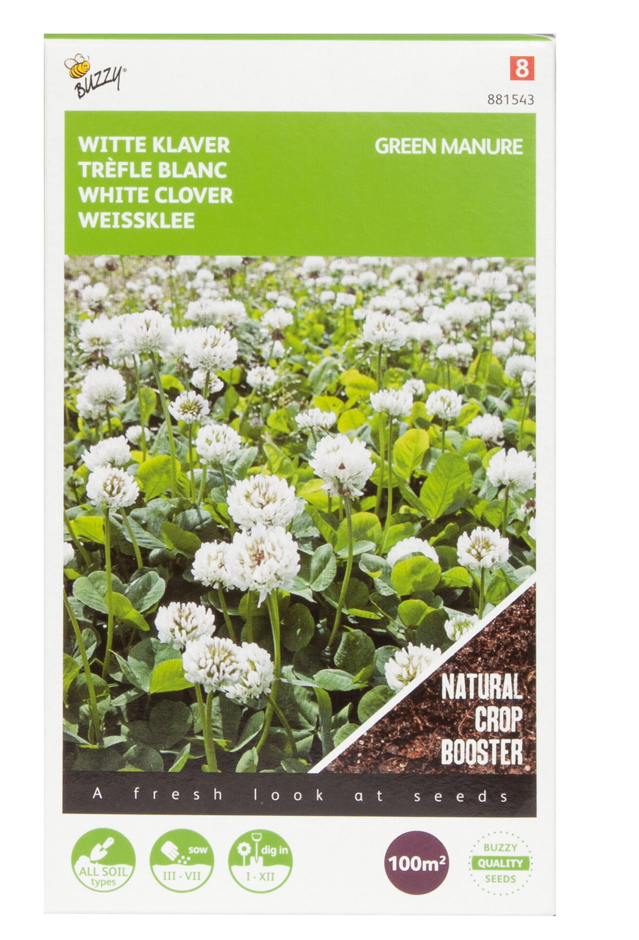 Witte klaver is een voedergewas en een grondverbeteraar en is geschikt voor alle grondsoorten, mits pH minimaal 4.5 is. Zeer diepgaande wortels, wat voor een goede doorluchting van de grond zorgt. Verder is witte klaver een zeer goede stikstofbinder. Witte klaver wordt druk bezocht door bijen. Zaaitijd: maart tot juli. Zaai-diepte: 1-1,5cm.